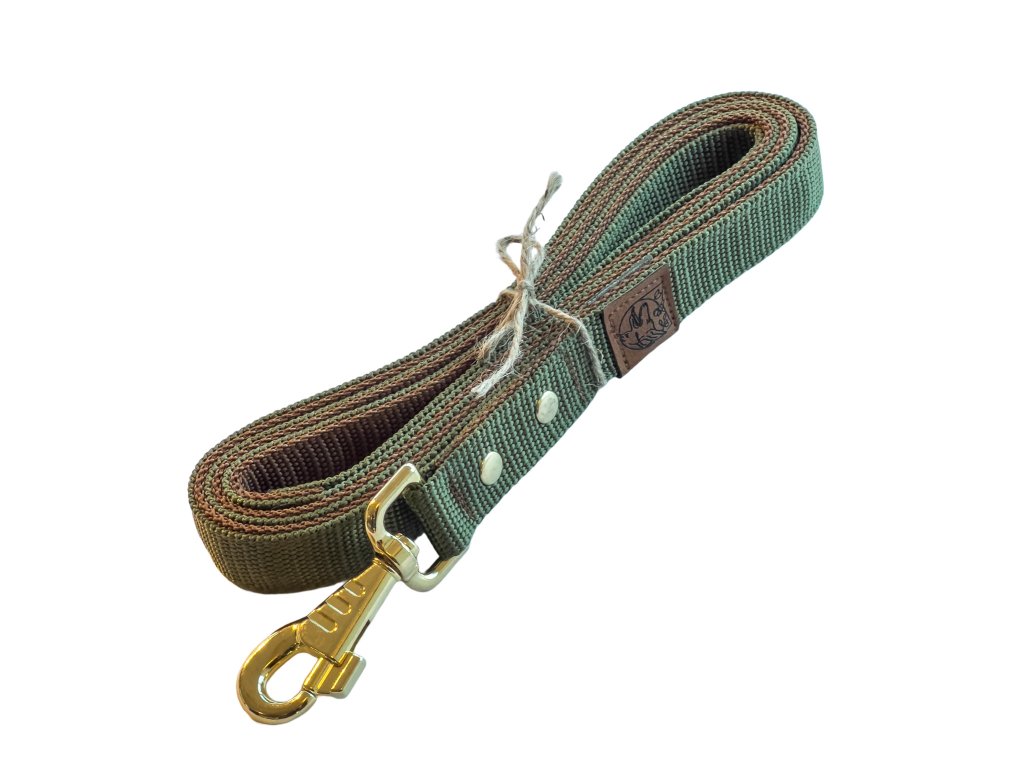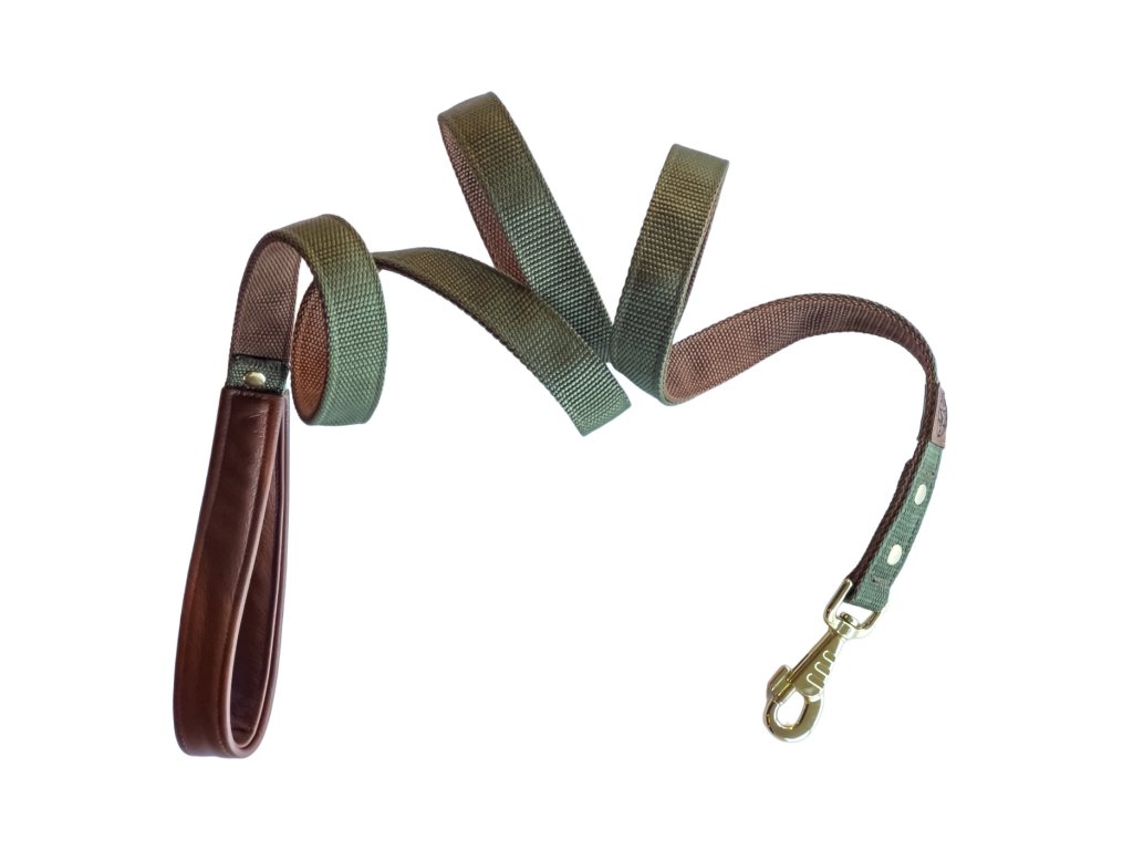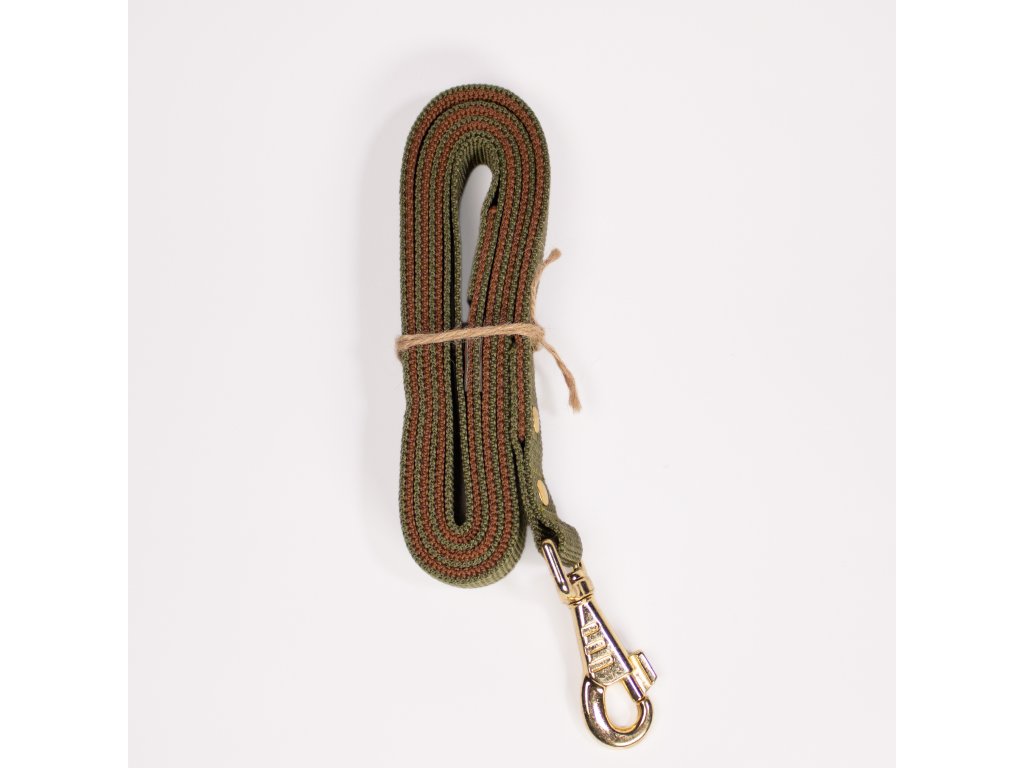 Mimořádně pevné dvouvrstvé hnědo-zelené vodítko ze dvou spojených popruhů se zlatými a koženými prvky. Ideální pro velké a silné psy. Vyrobené ručně v ČR pro sport, trénink i každodenní procházky. Délky 150 a 170 cm.