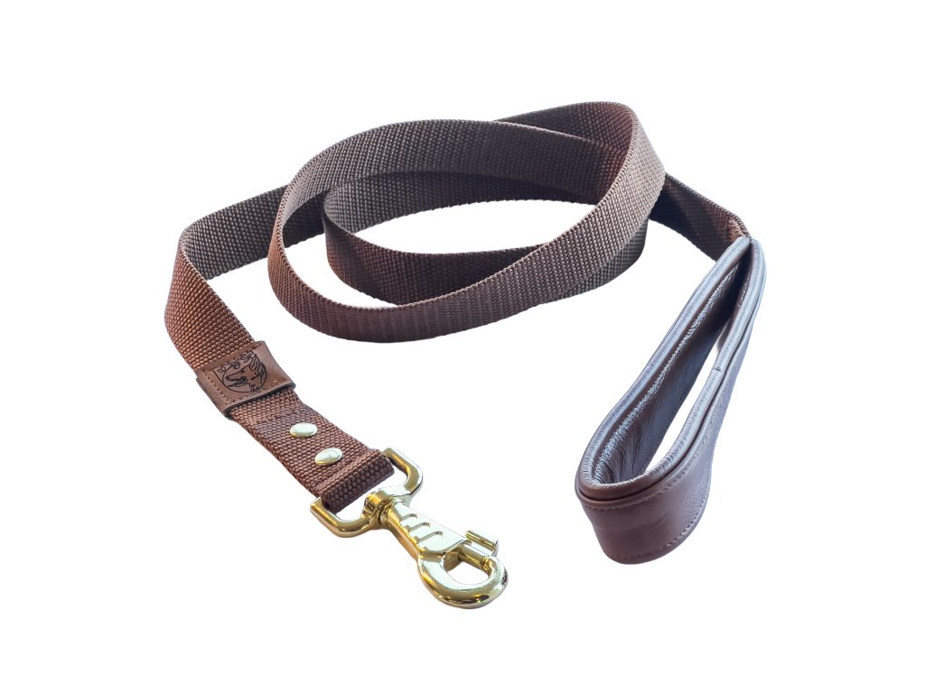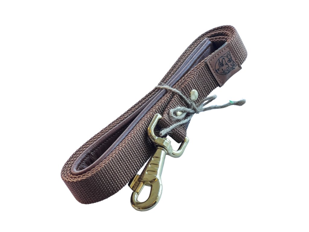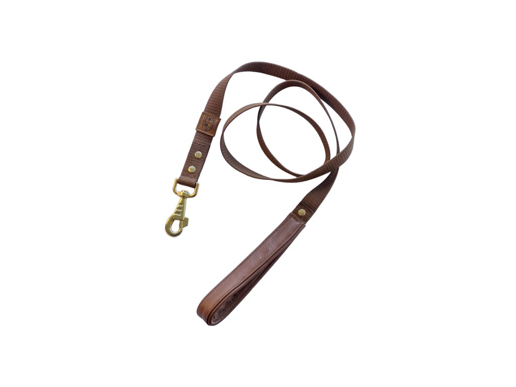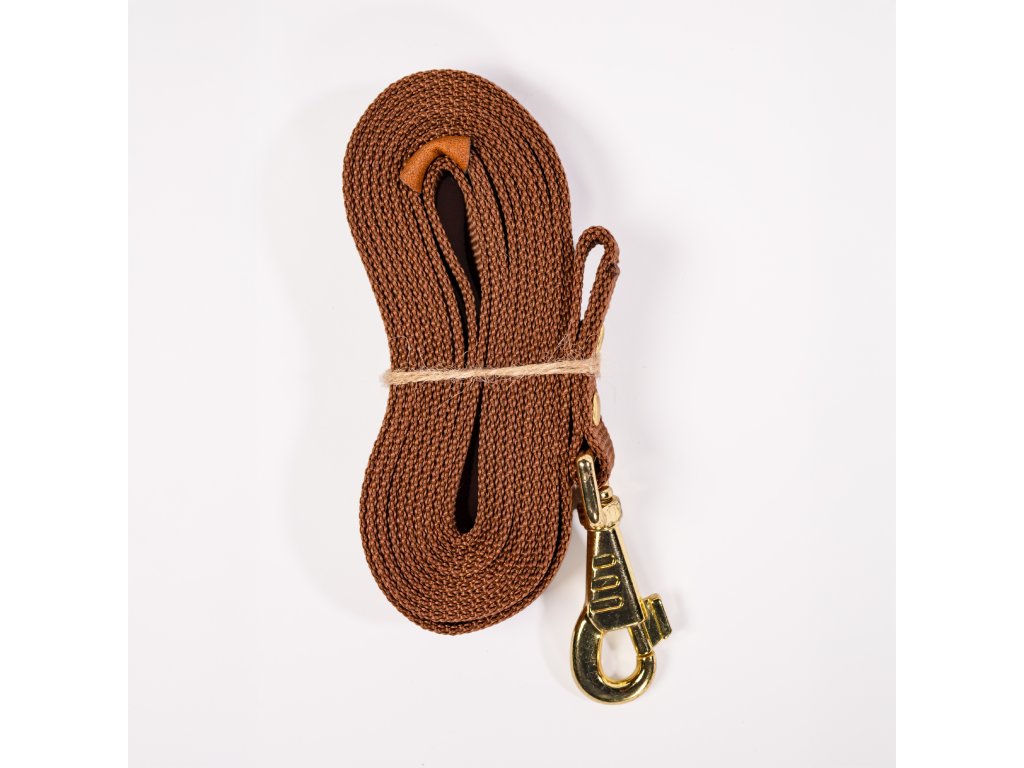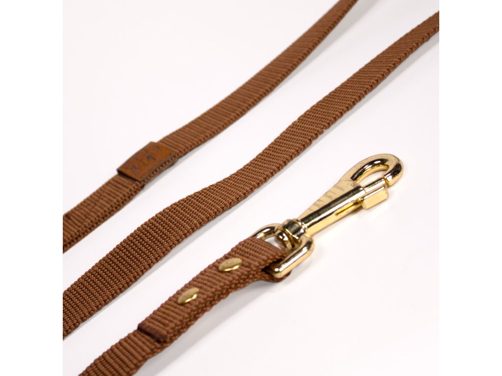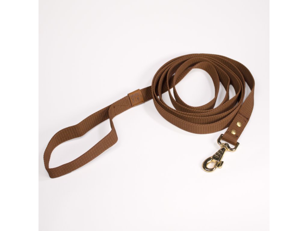 Ručně vyráběné minimalistické hnědé vodítko z odolného popruhu se zlatými a koženými prvky. Příjemné do ruky, pevné a vhodné pro malé i velké psy. Délky 150, 170 a 300 cm. Ideální pro procházky i základní výcvik.