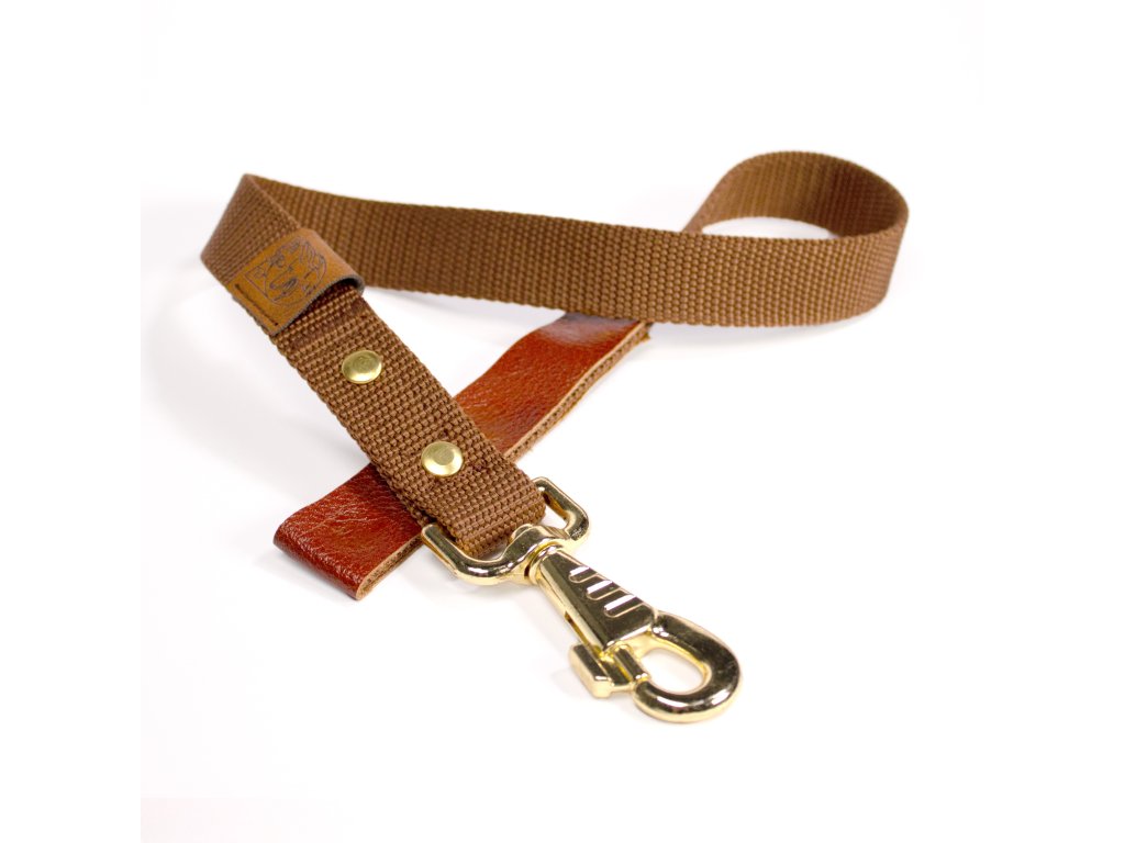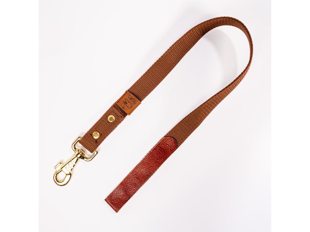 Ručně vyráběná hnědá couračka z odolného popruhu. Krátké vodítko s koženou rukojetí a zlatými prvky určené pro trénink poslušnosti, rychlou manipulaci a bezpečné vedení psa na place. Délky 30, 45 a 55 cm pro velké i malé psy. Lehká, pevná a designová - ideální pro sportovní výcvik.